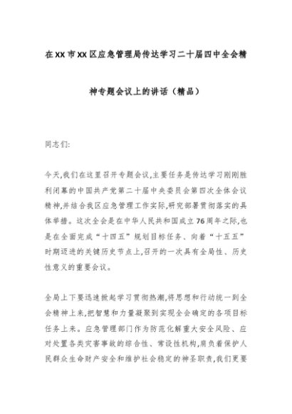 / 在XX市XX区应急管理局传达学习二十届四中全会精神专题会议上的讲话(精品)