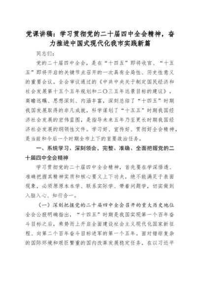 / 党课讲稿:学习贯彻党的二十届四中全会精神,奋力推进中国式现代化我市实践新篇