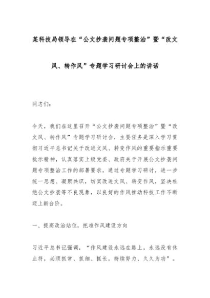 / 某科技局领导在“公文抄袭问题专项整治”暨“改文风、转作风”专题学习研讨会上的讲话
