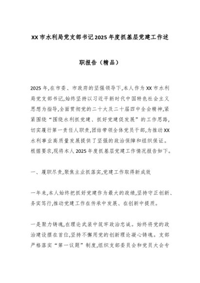/ XX市水利局党支部书记2025年度抓基层党建工作述职报告(精品)
