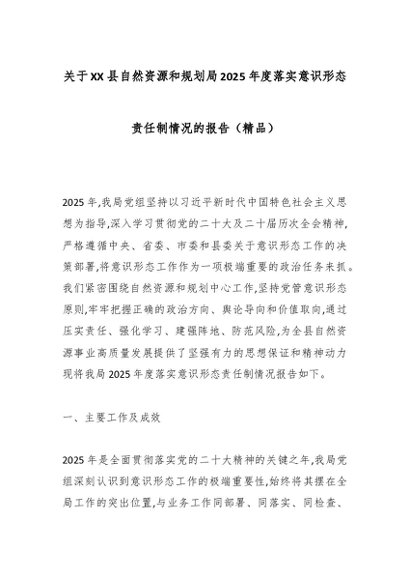 / 关于XX县自然资源和规划局2025年度落实意识形态责任制情况的报告(精品)