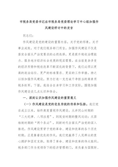 / 市税务局党委书记在市税务局党委理论学习中心组加强作风建设研讨中的发言