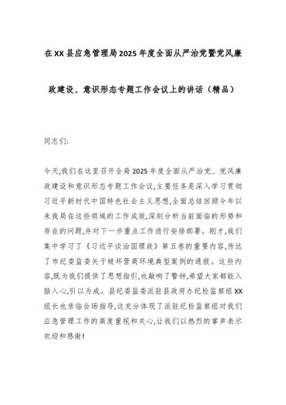 / 在XX县应急管理局2025年度全面从严治党暨党风廉政建设、意识形态专题工作会议上的讲话(精品)