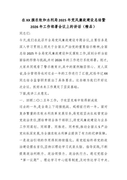 / 在XX旗农牧和水利局2025年党风廉政建设总结暨2026年工作部署会议上的讲话(精品)