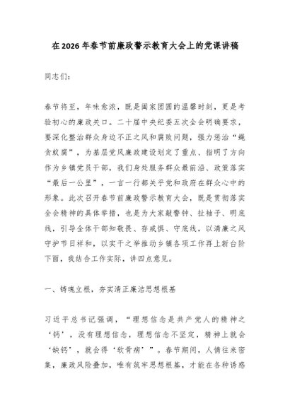 / 在2026年春节前廉政警示教育大会上的党课讲稿
