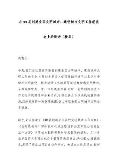 / 在XX县创建全国文明城市、建设城市文明工作动员会上的讲话(精品)