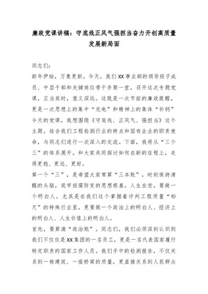 / 廉政党课讲稿:守底线正风气强担当奋力开创高质量发展新局面