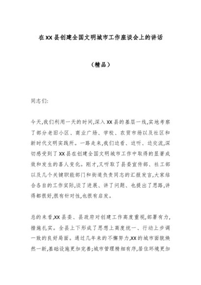 / 在XX县创建全国文明城市工作座谈会上的讲话(精品)