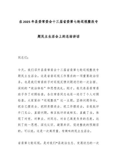 / 在2025年县委常委会十三届省委第七轮巡视整改专题民主生活会上的总结讲话