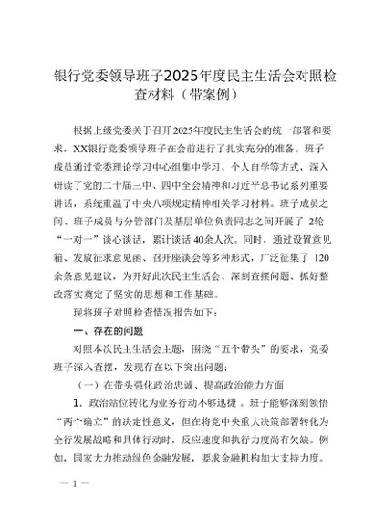 / 银行党委领导班子2025年度民主生活会对照检查材料(带案例)