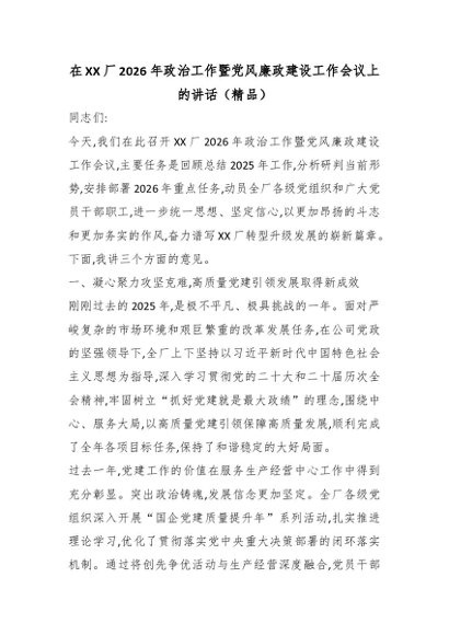 / 在XX厂2026年政治工作暨党风廉政建设工作会议上的讲话(精品)