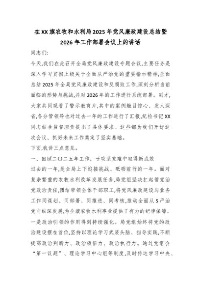/ 在XX旗农牧和水利局2025年党风廉政建设总结暨2026年工作部署会议上的讲话