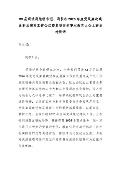/ XX县司法局党组书记、局长在2026年度党风廉政建设和反腐败工作会议暨典型案例警示教育大会上的主持讲话