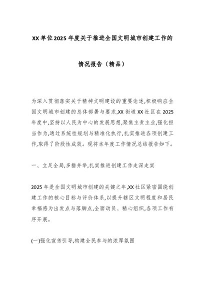 / XX单位2025年度关于推进全国文明城市创建工作的情况报告(精品)
