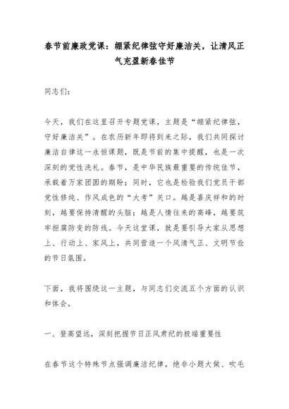 春节前廉政党课:绷紧纪律弦守好廉洁关,让清风正气充盈新春佳节