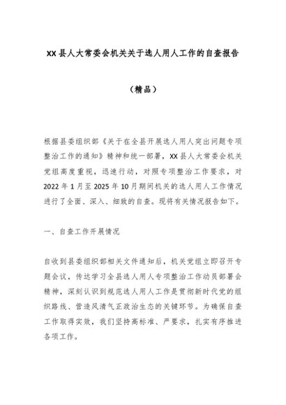 / XX县人大常委会机关关于选人用人工作的自查报告(精品)
