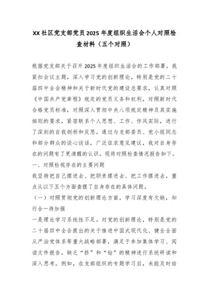 / XX社区党支部党员2025年度组织生活会个人对照检查材料(五个对照)