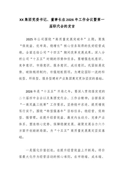 / XX集团党委书记、董事长在2026年工作会议暨第一届职代会的发言