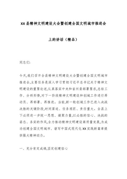 / XX县精神文明建设大会暨创建全国文明城市推进会上的讲话(精品)