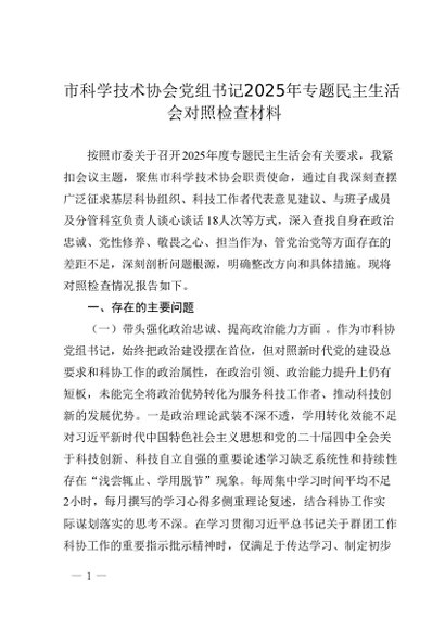 / 市科学技术协会党组书记2025年专题民主生活会对照检查材料