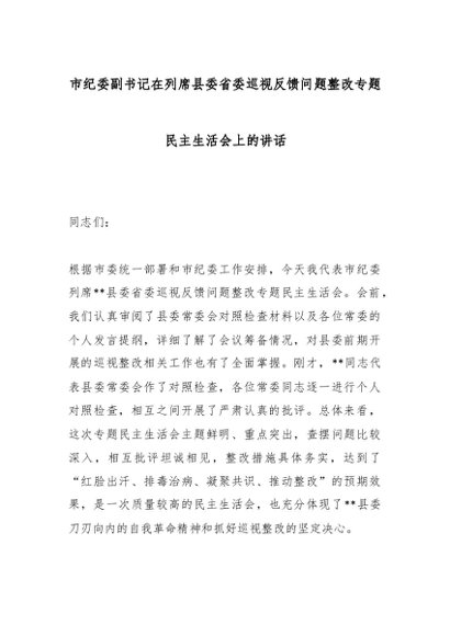 / 市纪委副书记在列席县委省委巡视反馈问题整改专题民主生活会上的讲话