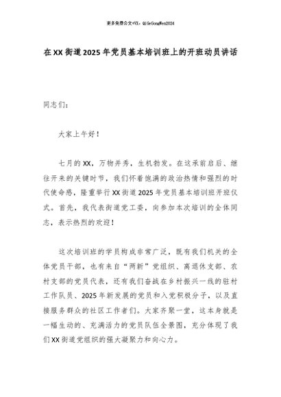 / 在XX街道2025年党员基本培训班上的开班动员讲话