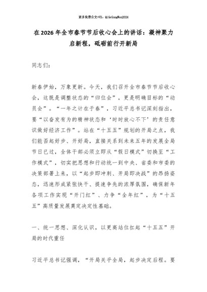 / 在2026年全市春节节后收心会上的讲话:凝神聚力启新程,砥砺前行开新局