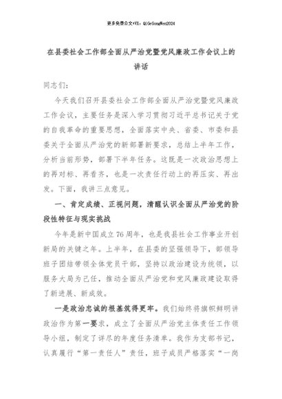 / 在县委社会工作部全面从严治党暨党风廉政工作会议上的讲话