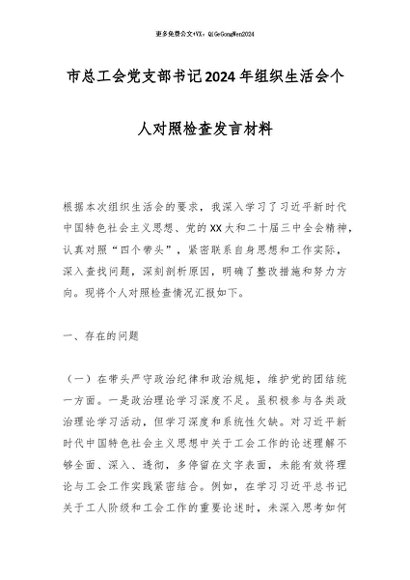 / 市总工会党支部书记2024年组织生活会个人对照检查发言材料
