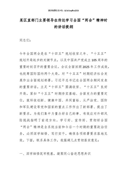 / 某区直部门主要领导在传达学习全国“两会”精神时的讲话提纲