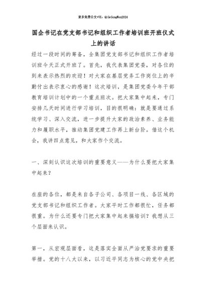 / 国企书记在党支部书记和组织工作者培训班开班仪式上的讲话