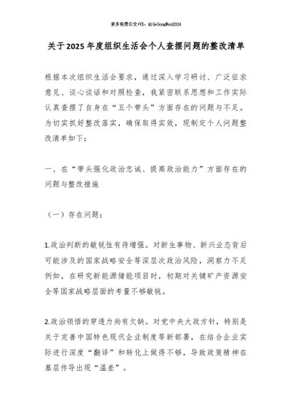 / 关于2025年度组织生活会个人查摆问题的整改清单(集团公司)