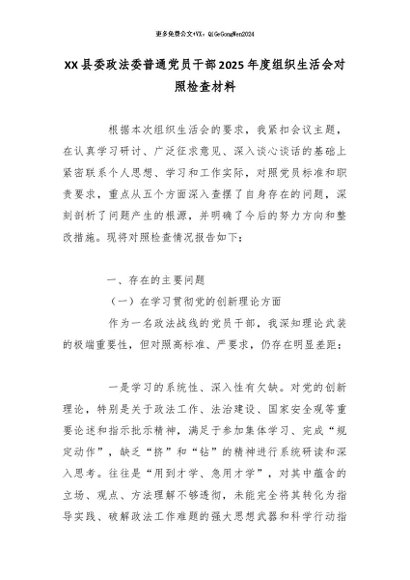 / XX县委政法委普通党员干部2025年度组织生活会对照检查材料2