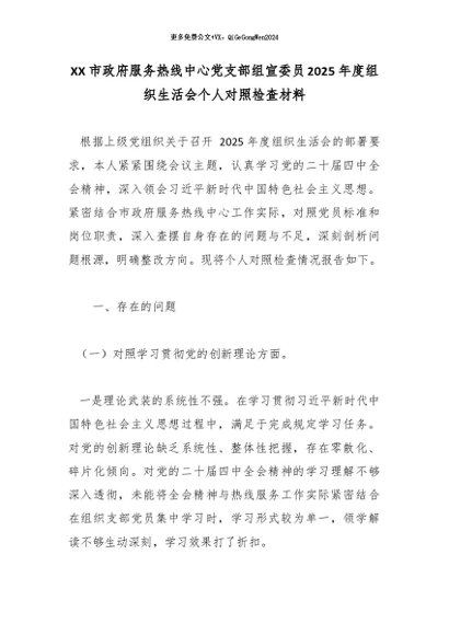 / XX市政府服务热线中心党支部组宣委员2025年度组织生活会个人对照检查材料