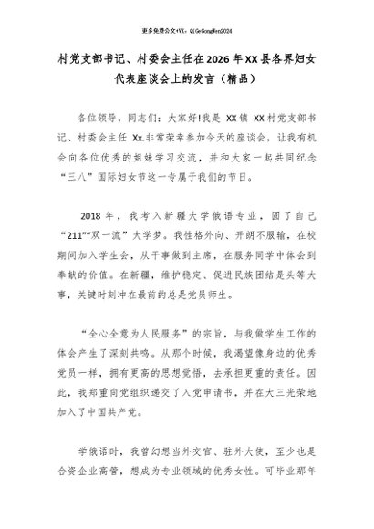 村党支部书记、村委会主任在2026年XX县各界妇女代表座谈会上的发言(精品)
