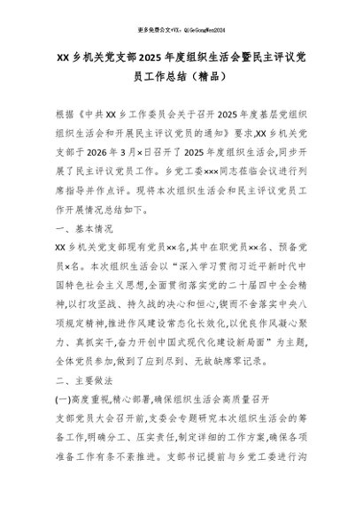 / XX乡机关党支部2025年度组织生活会暨民主评议党员工作总结(精品)