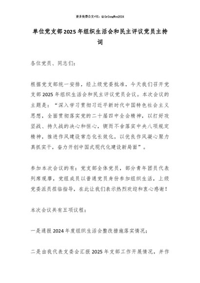 / 单位党支部2025年组织生活会和民主评议党员主持词
