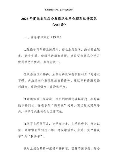 / 2025年度民主生活会及组织生活会相互批评意见(200条)