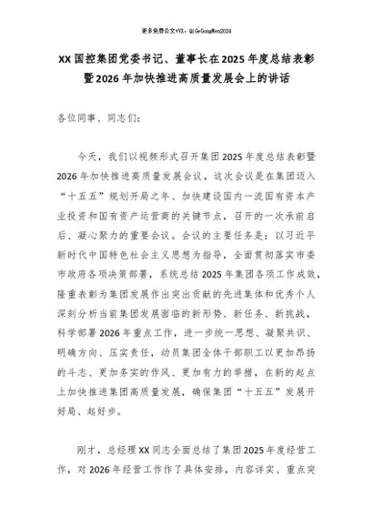 / XX国控集团党委书记、董事长在2025年度总结表彰暨2026年加快推进高质量发展会上的讲话