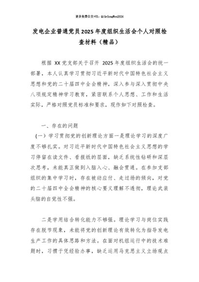 / 发电企业普通党员2025年度组织生活会个人对照检查材料(精品)