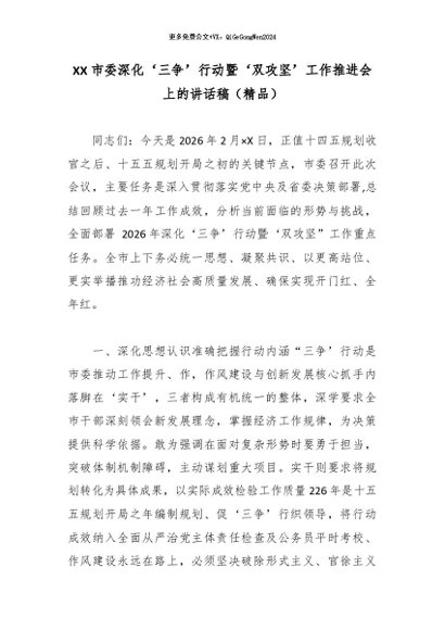 / XX市委深化‘三争’行动暨‘双攻坚’工作推进会上的讲话稿(精品)