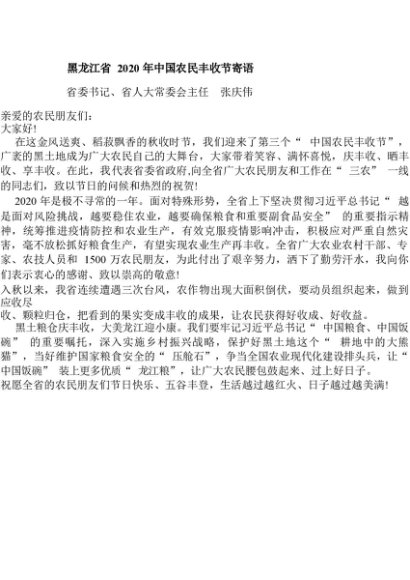 / 黑龙江省 2020 年中国农民丰收节寄语