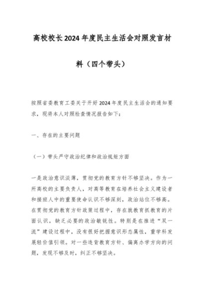 / 高校校长2024年度民主生活会对照发言材料(四个带头)