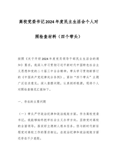 / 高校党委书记2024年度民主生活会个人对照检查材料(四个带头)