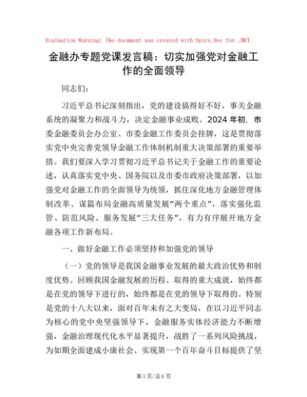 / 金融办专题党课发言稿:切实加强党对金融工作的全面领导