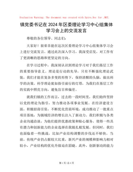 / 镇党委书记在2024年区委理论学习中心组集体学习会上的交流发言