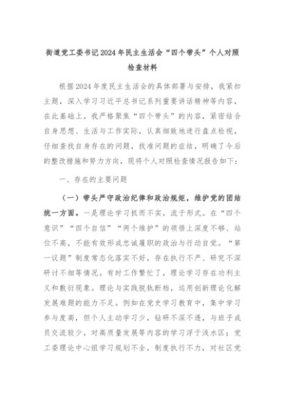 / 街道党工委书记2024年民主生活会“四个带头”个人对照检查材料