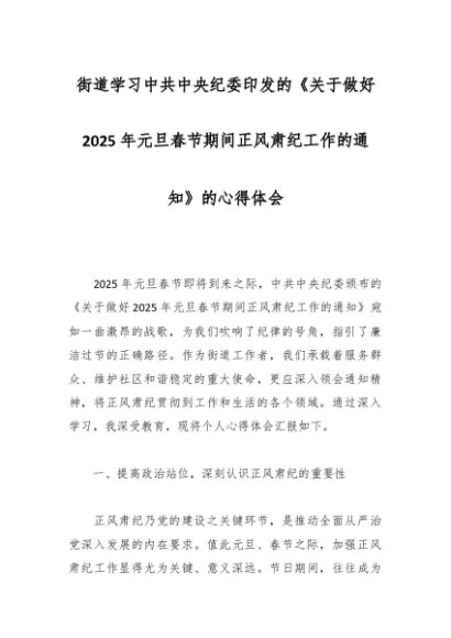 / 街道学习中共中央纪委印发的《关于做好2025年元旦春节期间正风肃纪工作的通知》的心得体会