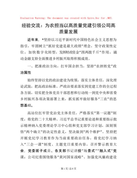 经验交流:为农担当 以高质量党建引领公司高质量发展