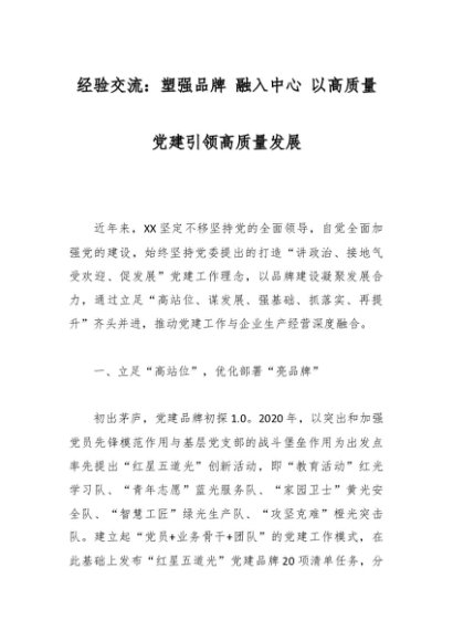 / 经验交流:塑强品牌 融入中心 以高质量党建引领高质量发展